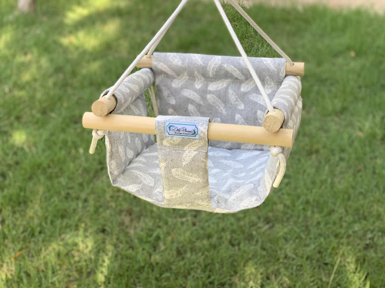 Columpio para niños, de tela, acolchado y confeccionado con costuras reforzadas, palos redondos de madera nativa! para usar en interior o exterior bajo techo.